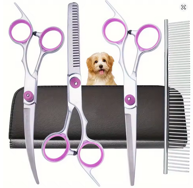 The ProTrim Stainless Steel Pet Grooming Scissors Set gives you the tools you need to groom your pet like a professional right at home. Featuring both curved and straight scissors, this set is perfect for trimming around the face, paws, ears, and body with precision and safety. Crafted from high-quality stainless steel, the blades are sharp, durable, and designed for smooth, clean cuts without pulling. Whether you’re maintaining a full coat or just touching up, this grooming set is ideal for dogs, cats, and home salon use.